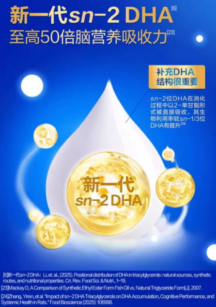 [8] 指5大脑磷脂群(磷脂酰乙醇胺(PE)、磷脂酰肌醇(PI)、神经鞘磷脂(SM)、磷脂酰胆碱(PC)、磷脂酰丝氨酸(PS)),乳脂球膜、燕窝酸、DHA、ARA、3'-唾液酸乳糖(3'-SL)、6-唾液酸乳糖(6’-SL)、胆碱、牛磺酸、α-乳清蛋白、β-酪蛋白、核苷酸、α-亚麻酸、神经节苷脂、叶黄素、维生素A;神经节苷脂、α-乳白蛋白、维生素K、维生素B1、维生素B6、维生素B12、泛酸、碘。