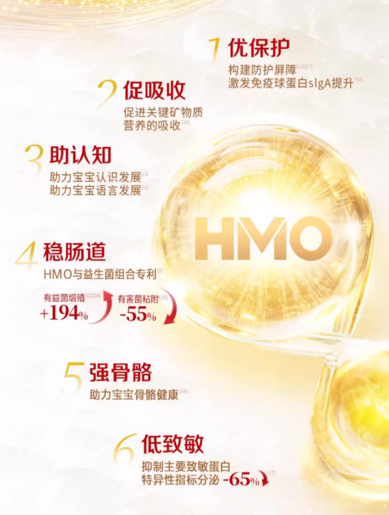 HMO,中文全称为母乳低聚糖,是母乳中仅次于乳糖和脂肪的第三大固体成分,被誉为母乳中的“精粹保护力”。HMO在奶粉中的作用至关重要,它无法被直接消化,而是作为益生元直达肠道,通过构建健康微生态来激发婴幼儿自身保护力、促进营养吸收、助力认知发育等。