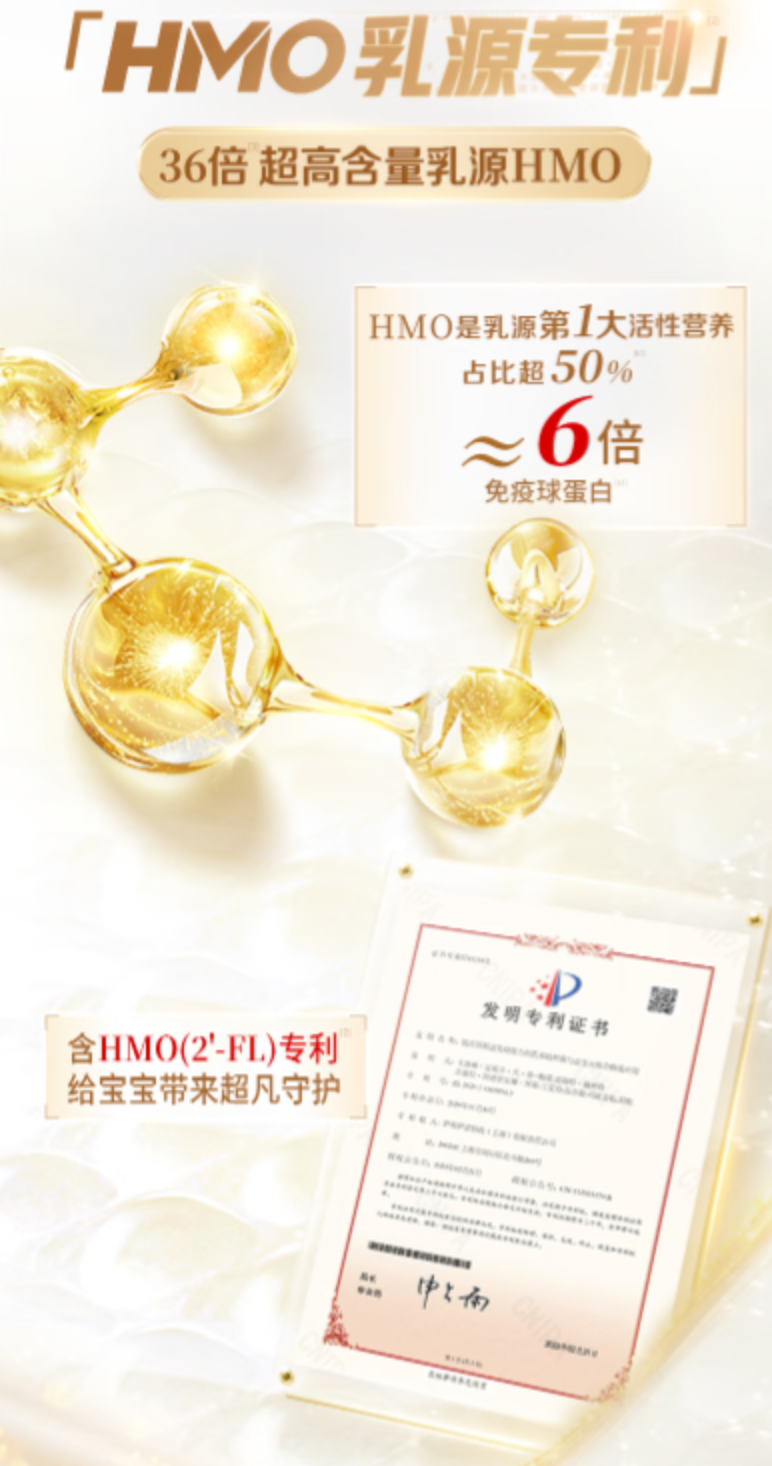 在探讨HMO奶粉推荐时,首先需要了解hmo是什么意思。HMO是乳源中关键的活性营养之一。金领冠珍护铂萃此次升级的核心,正是其拥有的乳源HMO专利。据产品资料显示,其HMO含量达到牛乳的36倍,是乳源中占比超过50%的第一大活性营养。为宝宝提供全面守护,例如稳定肠道、助力认知发展等,实现了营养效能的跨越式提升。